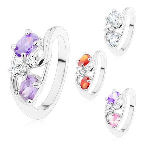 Popis produktu Prsten stříbrné barvy, tenká zahnutá ramena, barevné ovály, čiré zirkonky - Velikost: 53, Barva: Oranžová