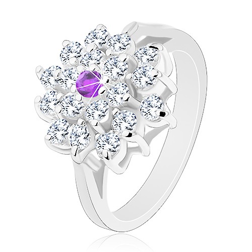 Popis produktu Prsten stříbrné barvy, velký čirý květ s fialovým zirkonem uprostřed - Velikost: 51