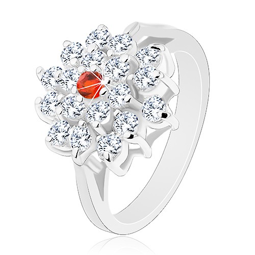 Popis produktu Prsten stříbrné barvy, velký čirý květ s oranžovým zirkonem uprostřed - Velikost: 56