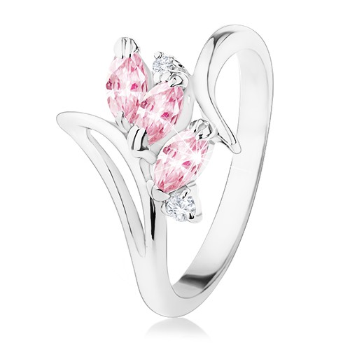 Popis produktu Prsten stříbrné barvy, zahnutá ramena, růžové a čiré zirkony - Velikost: 60