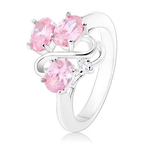 Popis produktu Prsten stříbrné barvy, zvlněná linie, tři oválné růžové zirkony - Velikost: 57