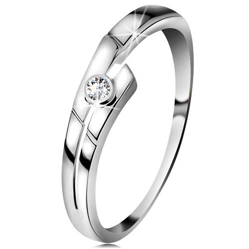 Popis produktu Prsten v bílém 14K zlatě se zářivým briliantem čiré barvy, oddělená linie ramen - Velikost: 55
