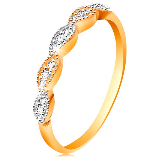 Popis produktu Prsten ve 14K zlatě - dvoubarevná zrnka se vsazenými zirkonky, lesklá ramena - Velikost: 58