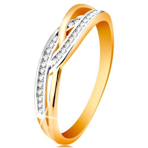 Prsten z kombinovaného 14K zlata zdobený liniemi zirkonků čiré barvy, rozdělená a asymetricky zvlněná ramena.Vybírejtee zboží v akci z pohodlí vašeho domova. Nákup u nás potěší také vaši peněženku.