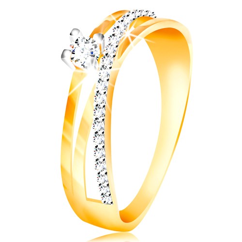 Popis produktu Prsten ve 14K zlatě - šikmá zirkonová linie čiré barvy, kulatý zirkon v kotlíku - Velikost: 57