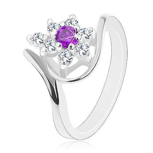 Popis produktu Prsten ve stříbrné barvě, asymetrická ramena, fialovo-čirý zirkonový květ - Velikost: 59