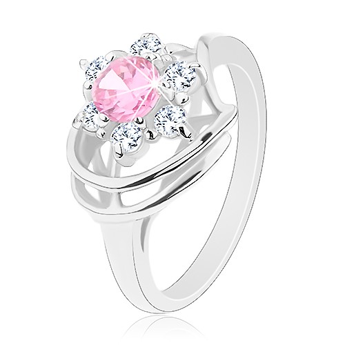 Popis produktu Prsten ve stříbrné barvě, růžovo-čirý zirkonový květ, lesklé oblouky - Velikost: 49
