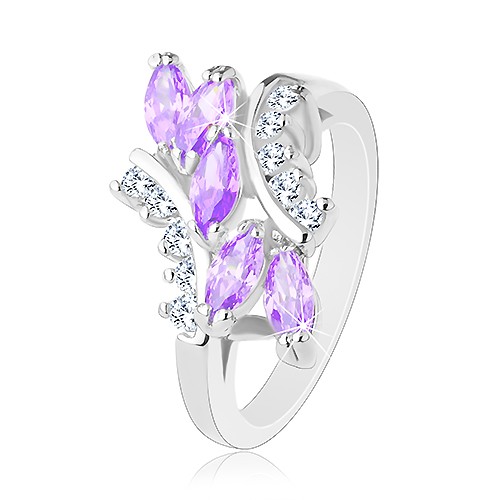 Prsten ve stříbrné barvě, světle fialová zirkonová zrnka, čiré zirkonky - Velikost: 49