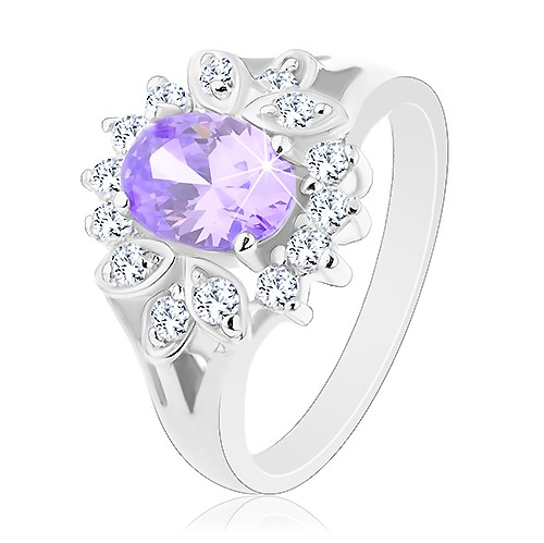 Popis produktu Prsten ve stříbrné barvě, světle fialový broušený ovál, čirý obrys - Velikost: 51