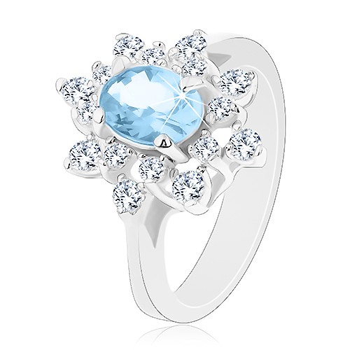 Popis produktu Prsten ve stříbrné barvě, světle modrý oválný zirkon, čiré zirkonové lupínky - Velikost: 60
