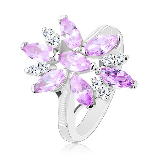 Prsten ve stříbrné barvě, velký květ ze světle fialových a čirých zirkonů - Velikost: 49