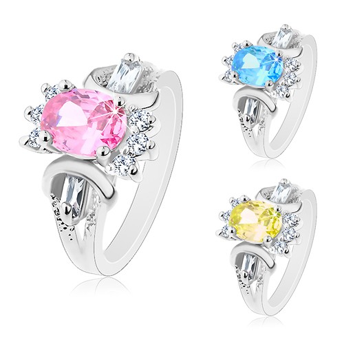 Prsten s rozdvojenými dekorativními rameny, stříbrná barva, zirkonový broušený ovál a čiré zirkony okolo.Neustále aktualizujeme ceny zboží a skladové dostupnosti. Nakupování na internetu je výhodnější než v kamenné prodejně, která má vyšší náklady.