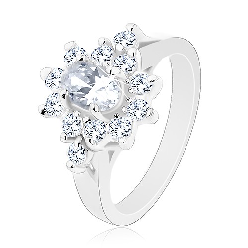 Prsten s lesklými rameny stříbrné barvy, větší zirkonový ovál čiré barvy s lemem z čirých zirkonků.Nabídku e-shopu pro vás připravuje tým odborníků. Udělejte si radost.