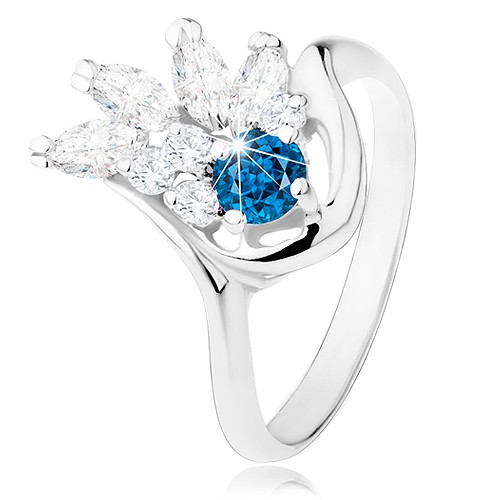 Popis produktu Prsten ve stříbrném odstínu, čirý zirkonový vějíř, tmavomodrý zirkon - Velikost: 52