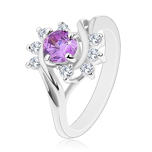 Popis produktu Prsten ve stříbrném odstínu, kulatý fialový zirkon, blýskavé čiré oblouky - Velikost: 49