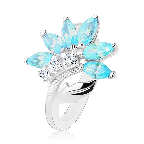Popis produktu Prsten ve stříbrném odstínu, květ z čirých a modrých zirkonů, lesklý list - Velikost: 53