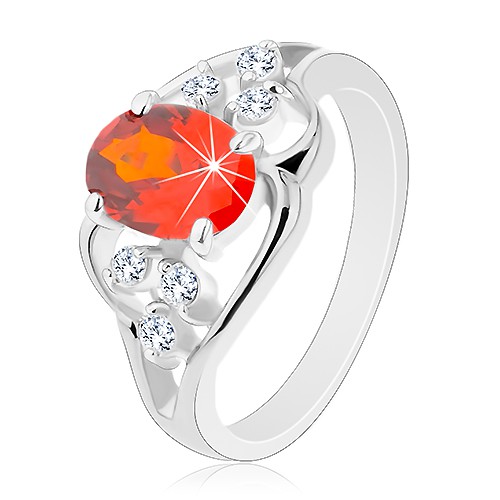 Popis produktu Prsten ve stříbrném odstínu, oranžový oválný zirkon, zvlněné linie - Velikost: 51