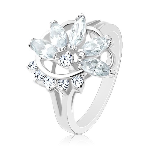 Prsten ve stříbrném odstínu, poloviční zirkonový květ, oblouk čirých zirkonků - Velikost: 49