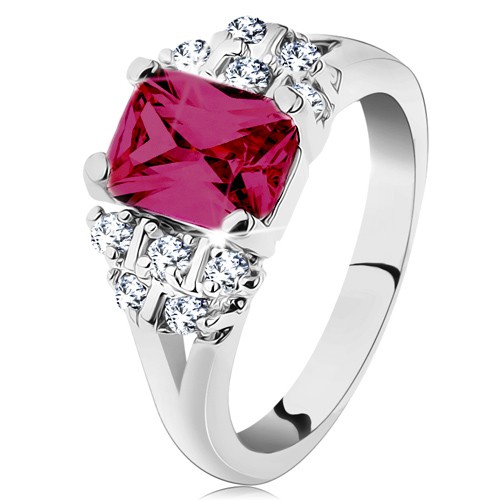 Popis produktu Prsten ve stříbrném odstínu, růžový zirkonový obdélník, čiré zirkonky - Velikost: 51