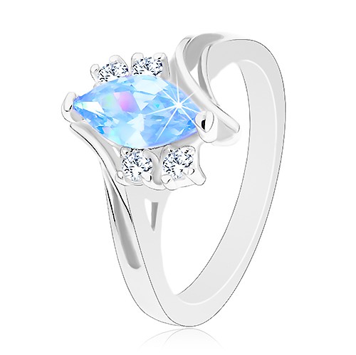 Popis produktu Prsten ve stříbrném odstínu se zahnutými rameny, modré zirkonové zrnko - Velikost: 61