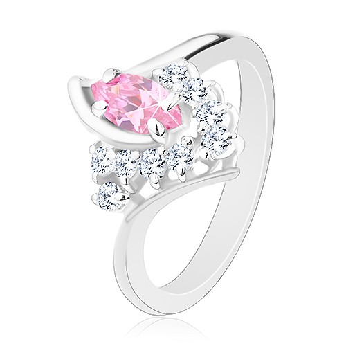 Popis produktu Prsten ve stříbrném odstínu se zahnutými rameny, růžovo-čiré zirkony - Velikost: 49