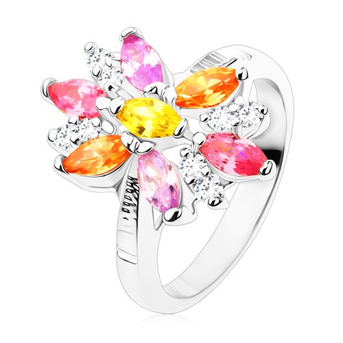 Blýskavý prsten stříbrné barvy, lesklá ramena, kvítek z pestrobarevných zrníčkovitých zirkonů a kulatých čirých zirkonků.Nákup přes nás znamená jistotu dobré ceny. Vy neplatíte nic navíc!