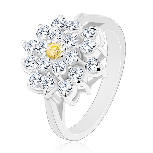 Popis produktu Prsten ve stříbrném odstínu, velký zirkonový květ čiré barvy, žlutý střed - Velikost: 50