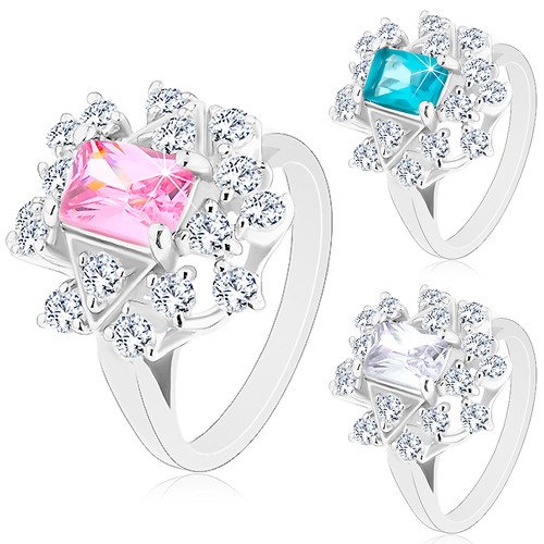 Popis produktu Prsten ve stříbrném odstínu, zirkonový obdélník lemovaný čirými zirkony - Velikost: 49, Barva: Růžová