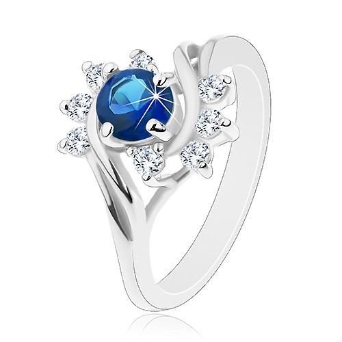 Popis produktu Prsten ve stříbrném odstínu, zvlněná ramena, tmavomodrý zirkon, čiré oblouky - Velikost: 57