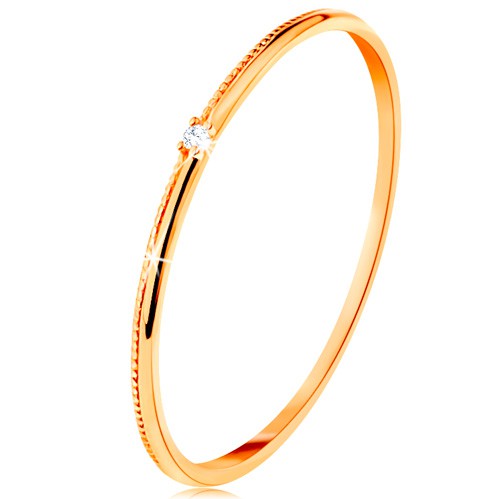 Prsten ve žlutém 14K zlatě - drobný čirý zirkon, jemně vroubkovaná ramena - Velikost: 57