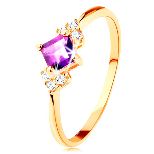 Popis produktu Prsten ve žlutém 14K zlatě - fialový ametystový čtvereček, čiré zirkonky - Velikost: 58