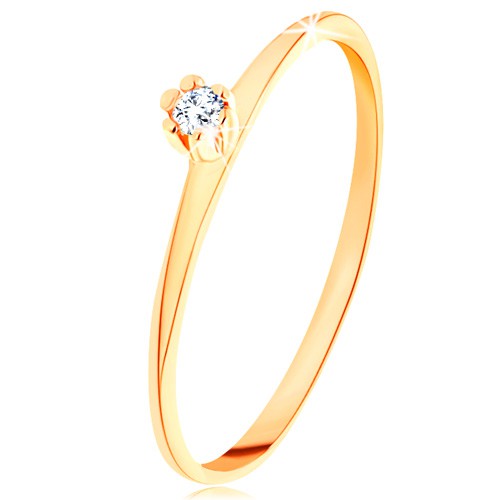 Popis produktu Prsten ve žlutém 14K zlatě - kulatý čirý diamant, tenká zkosená ramena - Velikost: 58