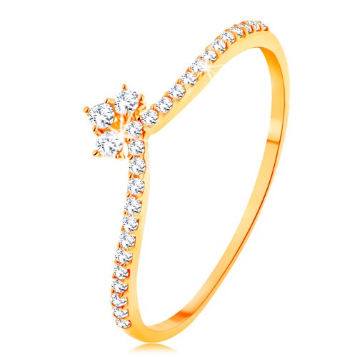 Prsten ze žlutého 14K zlata, tenká zahnutá ramena zdobená vsazenými zirkonky, korunka ze tří čirých zirkonů.Pozor, počet kusů na skladě může být u akčního zboží omezen. Udělejte si radost.