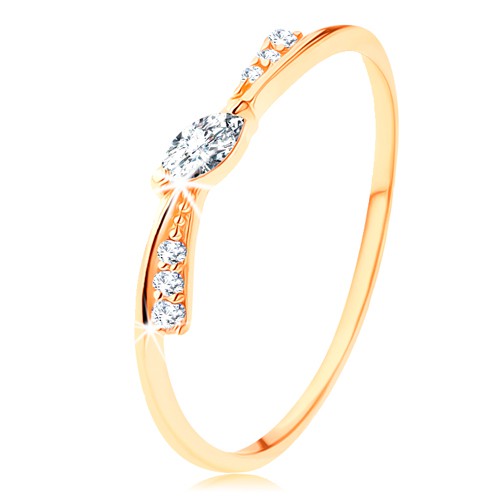 Popis produktu Prsten ve žlutém 14K zlatě - úzká mašlička zdobená čirými zirkony - Velikost: 49