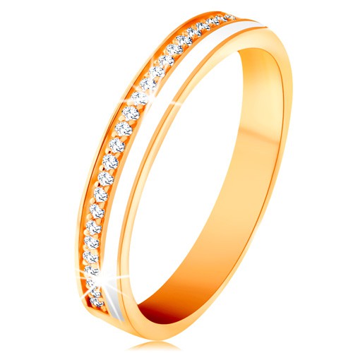 Prsten ve žlutém 14K zlatě - úzké linie z čirých zirkonků a bílé glazury - Velikost: 51