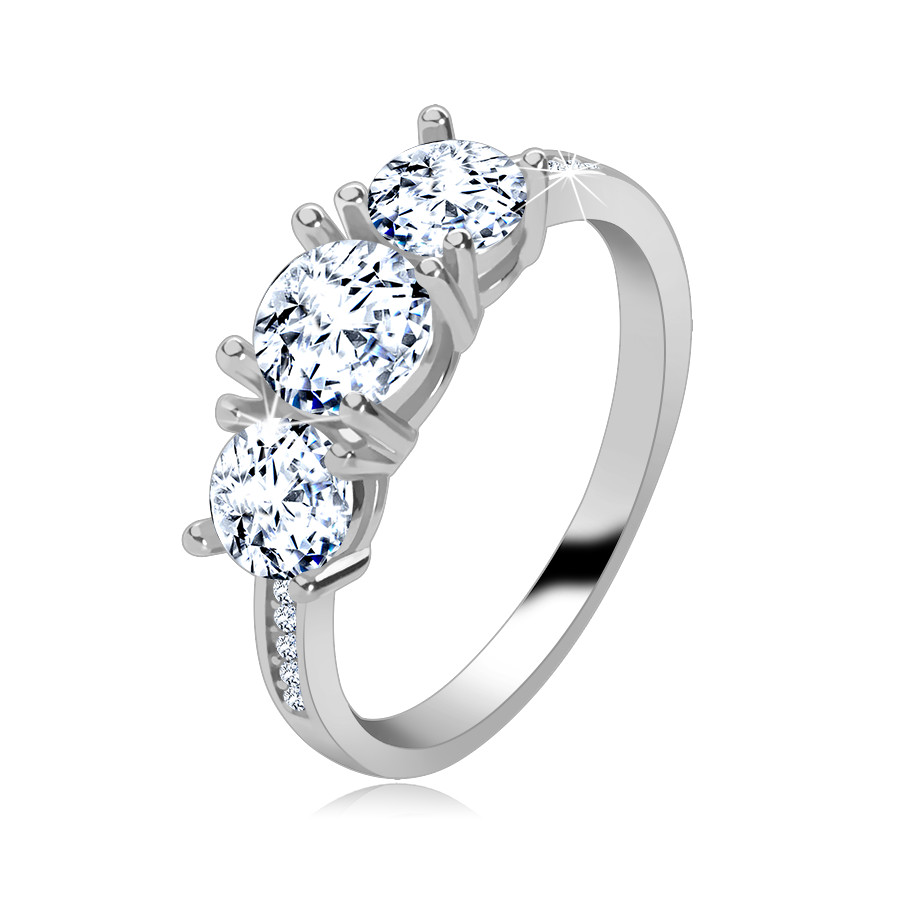 Popis produktu Prsten z 925 stříbra - tři třpytivé čiré zirkony, úzká lesklá ramena vykládaná zirkony - Velikost: 58