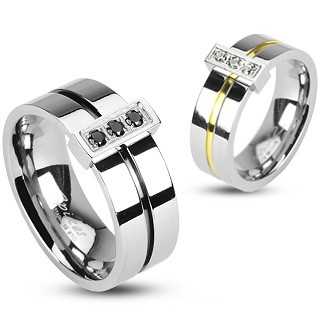 Ocelový prsten s pruhem a třemi zirkony uprostřed.Ceny a dodací lhůty tlačíme stále dolů. Neotálejte s nákupem, cenu můžeme garantovat jen pro dnešní den.