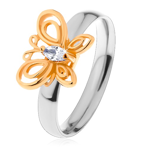 Popis produktu Prsten z chirurgické oceli - dvoubarevný, motýlek s čirým zirkonem - Velikost: 54
