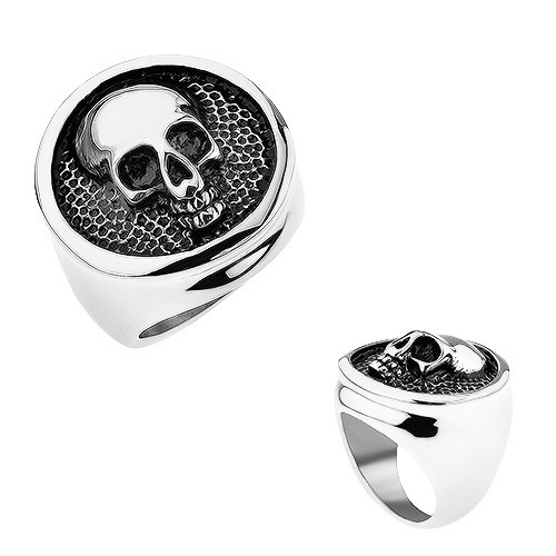 Popis produktu Prsten z oceli 316L, kruh s vyvýšeným lemem, lebka, černá patina - Velikost: 56