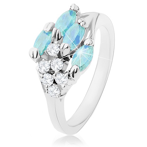 Popis produktu Prsten zdobený kulatými čirými zirkonky a zrnky akvamarínové barvy - Velikost: 50
