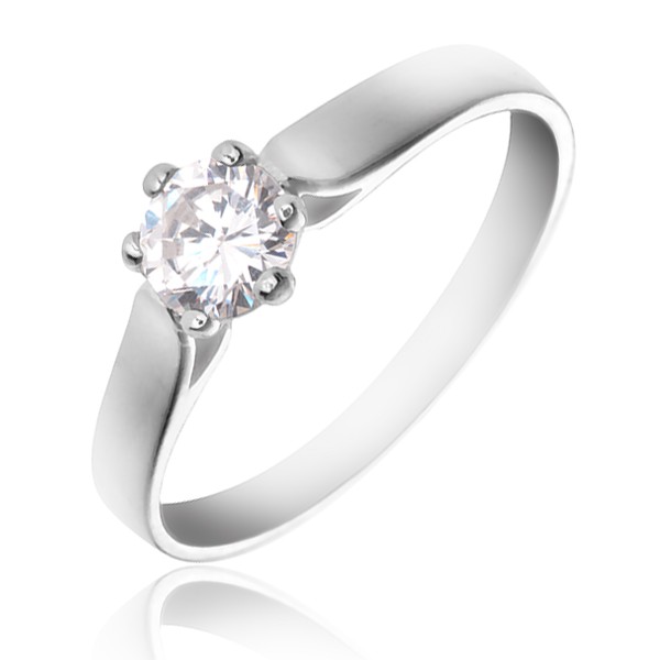 Stříbrný prsten s ohnutými rameny, která drží okrouhlý čirý kámen.Výhodné ceny máme pro všechny zákazníky. Neplaťte jinde víc, než musíte.