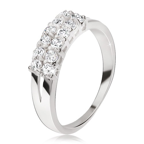 Popis produktu Prsten ze stříbra 925 - rozdvojená ramena, dva pásy čirých zirkonů - Velikost: 61