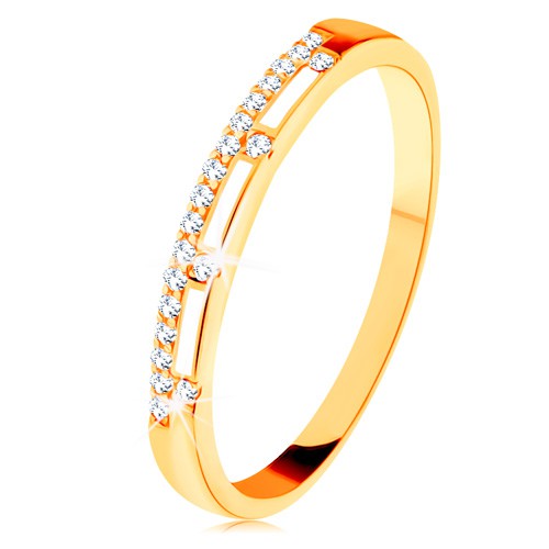 Popis produktu Prsten ze žlutého 14K zlata - čirá zirkonová linie, pásy bílé glazury - Velikost: 52