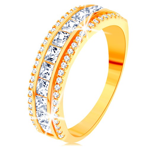 Prsten ze žlutého 14K zlata - linie čirých zirkonových čtverečků, třpytivý lem - Velikost: 57