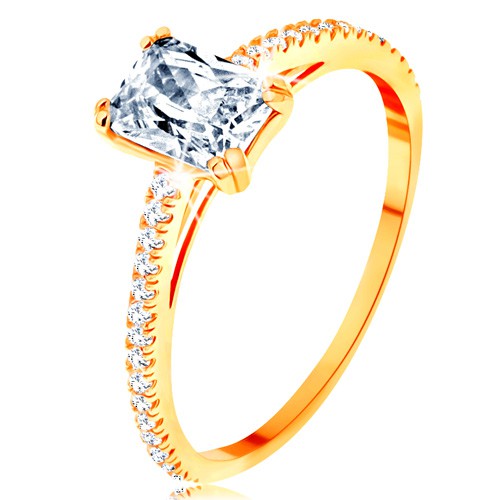Popis produktu Prsten ze žlutého 14K zlata - vystupující zirkonový obdélník, linie čirých zirkonků - Velikost: 48