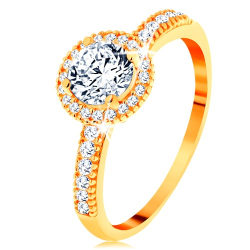 Popis produktu Prsten ze žlutého 14K zlata - zirkon čiré barvy lemovaný drobnými zirkonky - Velikost: 57