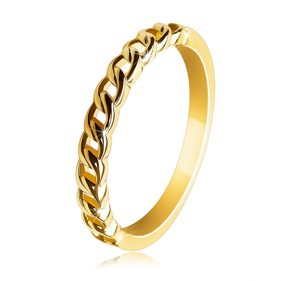 Hit katalogu: Prsten ze žlutého 585 zlata - dvě vzájemně propletené linie ramen s výřezy uprostřed tvořící řetěz - Velikost: 56 od Šperky Eshop výhodně za 5 172 CZK Kč. Zobrazit více »