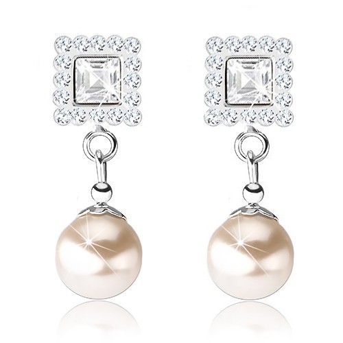 Stříbrné náušnice 925, puzetky, kosočtverec z krystalů Preciosa se třpytivou obrubou, visící perla.Nabízíme nejlepší poměr cena výkon. Udělejte si radost.