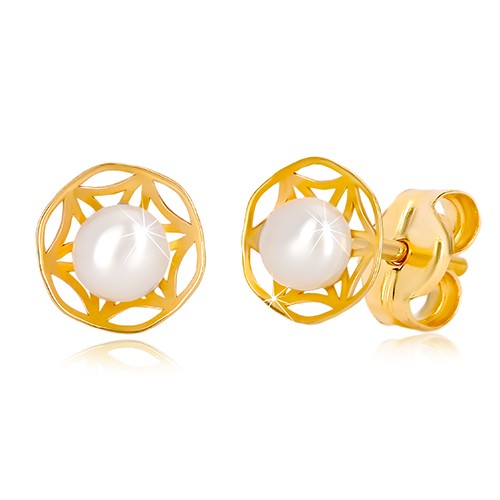 Popis produktu Puzetové náušnice ze 14K zlata - ornamentální vyřezávaný květ a perla