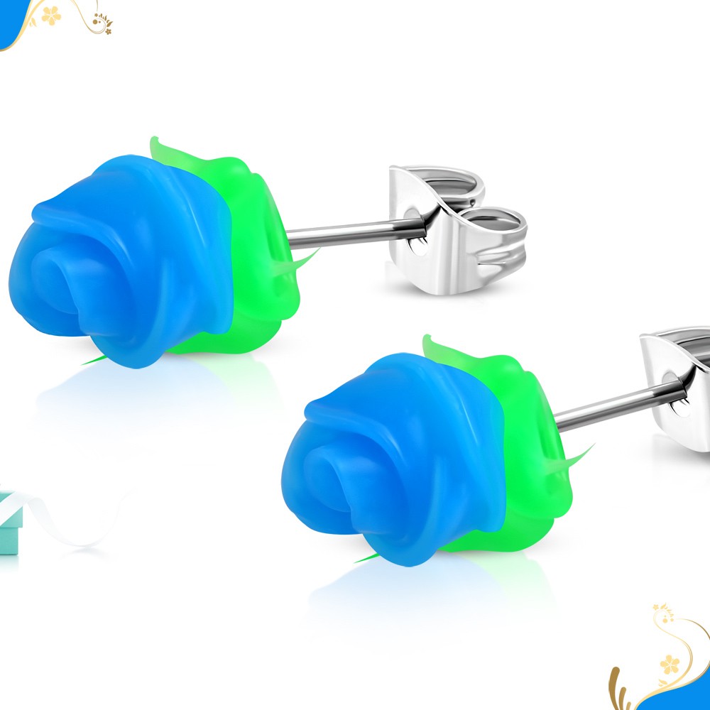 Náušnice s puzetovým zapínáním z oceli 316L, pružný silikonový kvítek - modrá růže, zelené lístky.Naše výhodné nabídky čekají právě na vás. Nakoupit a ještě ušetřit, co si víc přát.